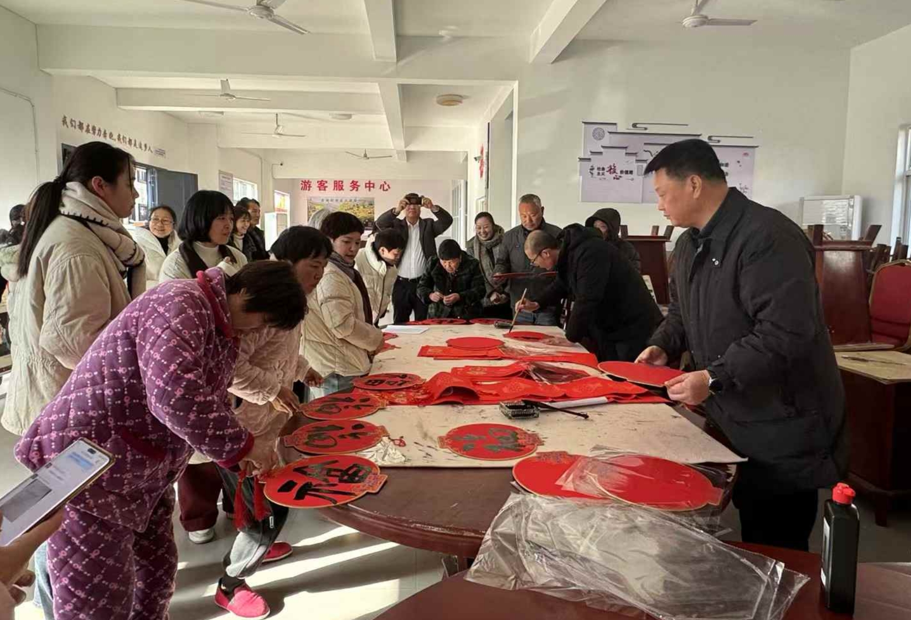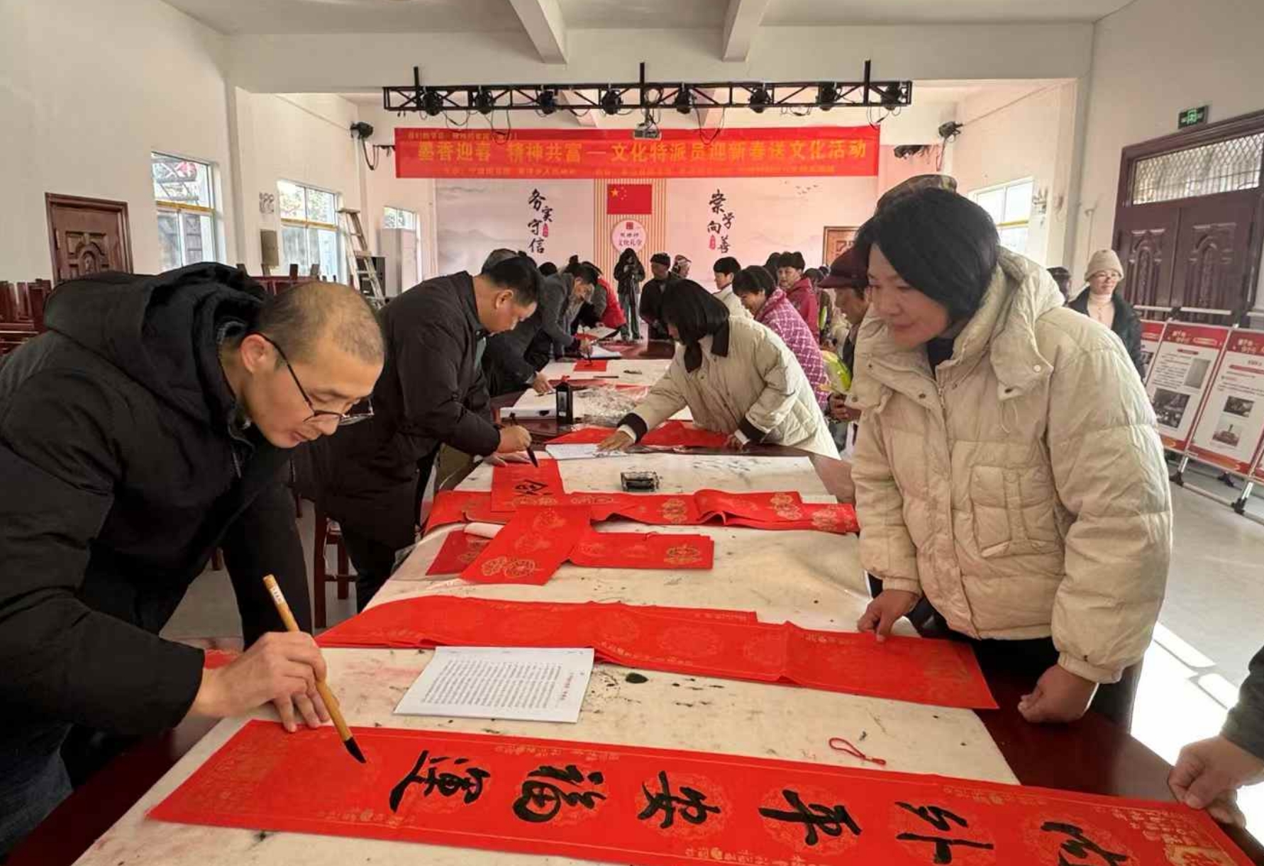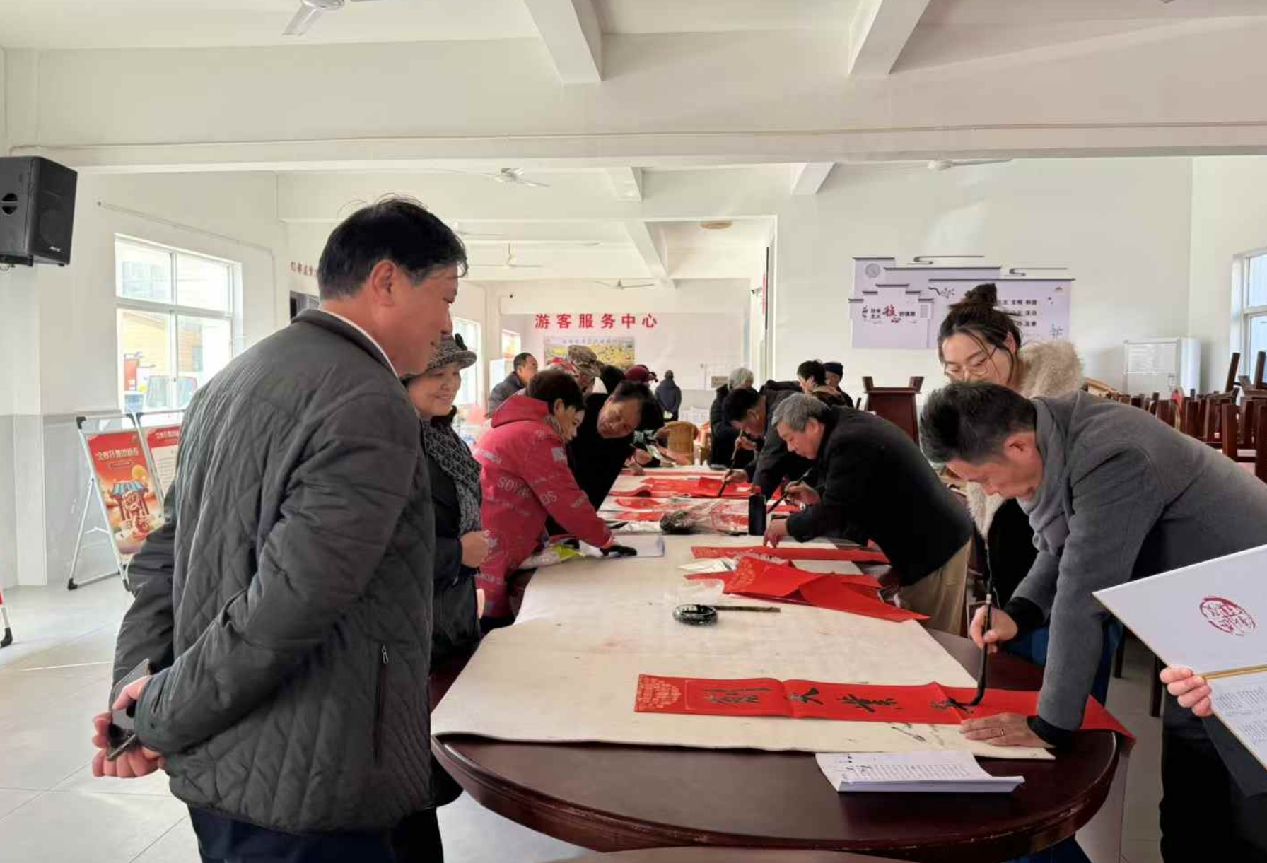 活动现场气氛热烈,村民们围在书法家身旁,看着笔锋游走,眼中满是欣喜与期待。拿到写好的春联,大家脸上都洋溢着幸福的笑容,纷纷表示手写的春联更有年味,这份来自文化馆的新年祝福格外暖心。